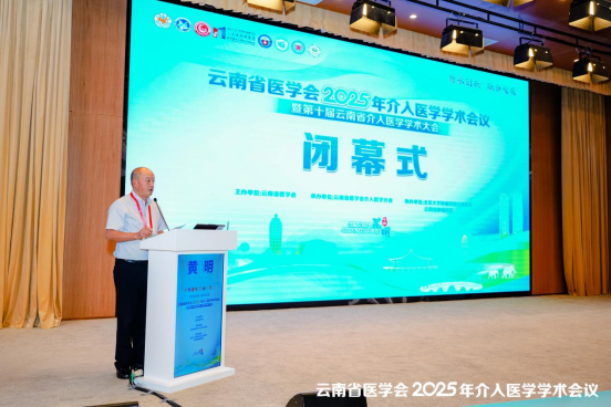 闭幕式由云南省医学会介入医学分会主任委员黄明教授主持并致辞,他表示云南省医学会2025届医学学术会议及第十届云南省介入医学学术会议,经过精心筹备,各项议程圆满完成。会议规模:历时三天,设1个主会场、8个分会场,参会350人次左右,省内专家130位、省外专家147位,发言164人次,主持139人次,主会场直播点击率15100人次平均每小时在线人数565人,涉及25个城市。围绕介入医学前沿发展与临床实践,从综合治疗、肿瘤、神经、血管、护理、肝肿瘤消融技术专项能力培训班等内容开展专题讲座等特色分会场,通过专题讲座、病例讨论、手术演示等搭建高水平学术平台。